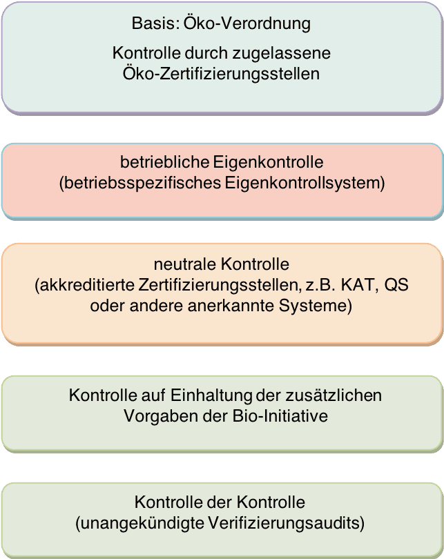 Les exigences sont les exigences légales du règlement de base biologique (CE) n° 834/2007 du Conseil ainsi que ses dispositions d'application avec le règlement (CE) n° 889/2008 de la Commission et les exigences spécifiques de l'initiative biologique. . Ceux-ci doivent être vérifiés au moins une fois par an. Les contrôles sont effectués de manière inopinée. Le certificat est prolongé d'un an à compter de l'inspection.